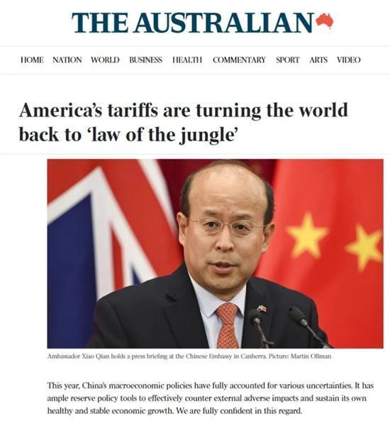 人民网堪培拉4月29日电 中国驻澳大利亚大使肖千24日在澳主流媒体《澳大利亚人报》评论版发表题为《如果国际社会重回“丛林法则”,我们拿什么维护自身正当权益?》的署名文章,指出美国向所有贸易伙伴滥施关税,胁迫各方在所谓“对等关税”谈判中做出重大让步,是典型的霸权霸凌行径,将颠覆现有国际规则秩序。如国际社会任由美肆意妄为,世界将重回“丛林法则”,所有国家都将沦为受害者。